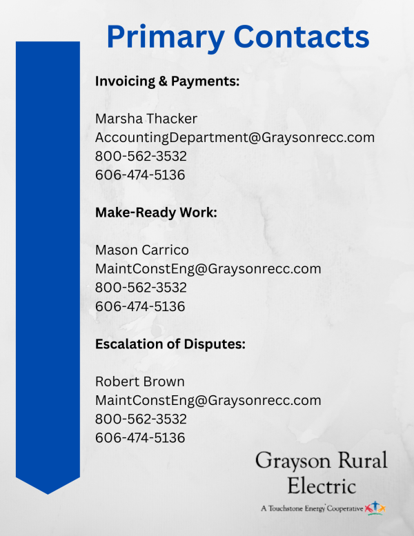 Should you have any further questions or require assistance in locating the information you need, please contact Mason Carrico for support. You can reach him at 800-562-3532; 606-474-5136 or via email at MaintConstEng@Graysonrecc.com