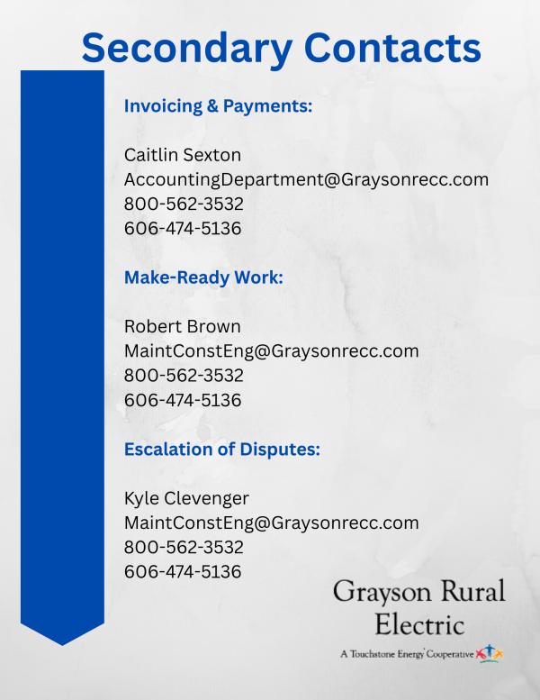 Should you have any further questions or require assistance in locating the information you need, please contact Mason Carrico for support. You can reach him at 800-562-3532; 606-474-5136 or via email at MaintConstEng@Graysonrecc.com